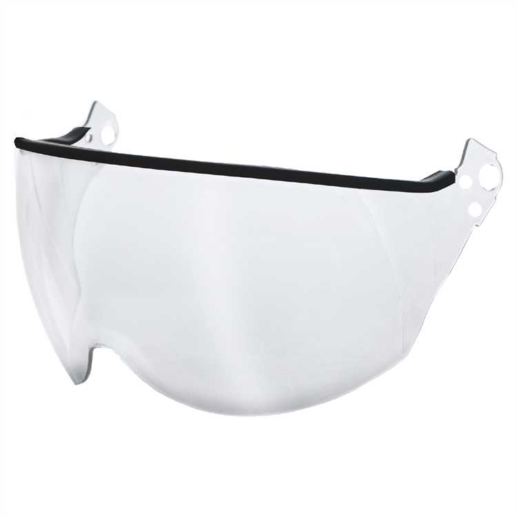Polykarbonatvisir med reptålig beläggning och anti-imbehandling. Visiret har en gummiprofil på den övre kanten för att skydda mot droppar och en kant med skärskydd för maximal komfort. Den ergonomiska och panoramiska designen gör det möjligt att bära visiret över korrigerande glasögon. Skruvsats för montering medföljer visiret.