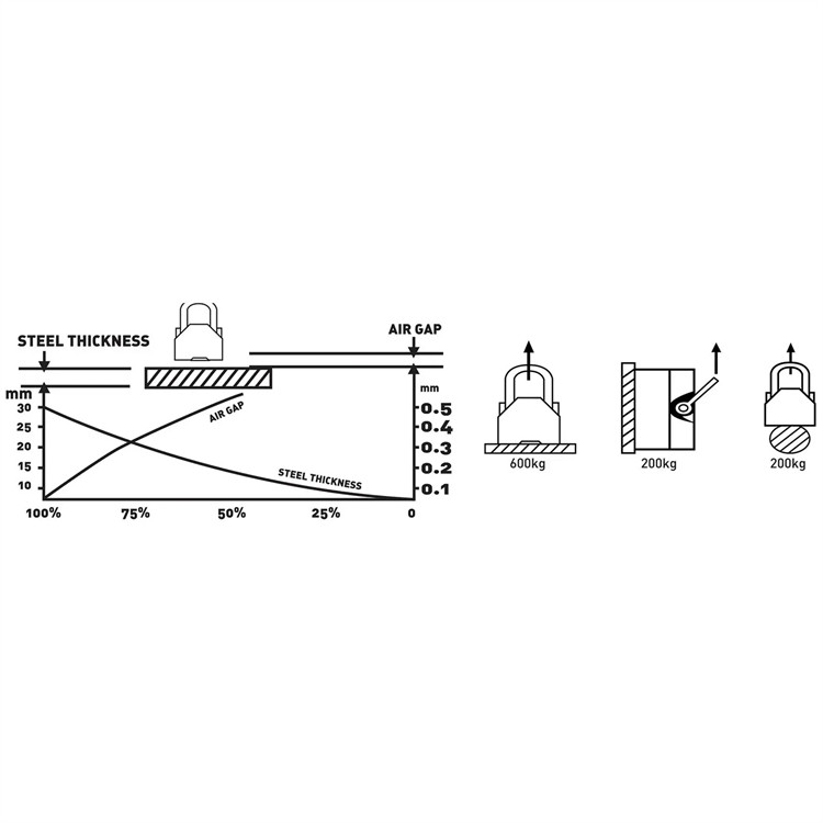 - Kraftfulla lyft – högenergi-neodymmagnet ger en maximal lyftkapacitet på 600 kg med en dragkraft på 1800 kg